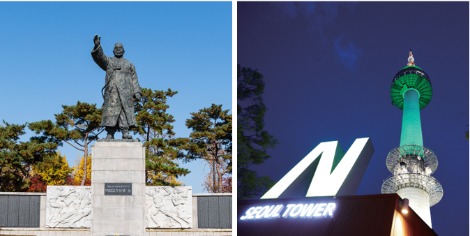 백범광장은 일제강점기 조선신궁 자리에 세워져, 독립운동가를 기리는 역사적 의미를 담고 있다.(좌) 최근 화제였던 넷플릭스 애니메이션 '케이팝데몬헌터스' 속 배경으로, 관광객들의 주목을 다시 받고 있다.(우)