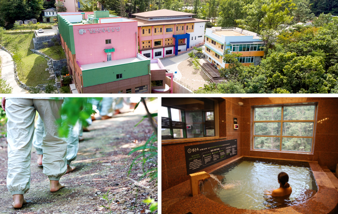 ‘자연 속에서 즐기는 웰 에이징’ 체험공간. 미세먼지 없는 숲 속 공간에서 스파와 찜질방 등을 즐기며 마음의 여유를 되찾을 수 있다. 건강한 식단, 체계적인 운동, 숲길 트레킹 등을 통해 몸과 마음의 리듬을 회복할 수 있는 장소다. 숲속동에서는 한밤의 별빛 감상도 가능.