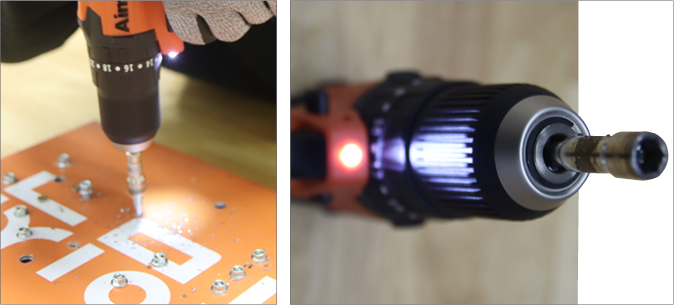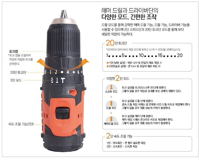 “이 제품은 전자식 속도 조절 기능을 가져서 작업자가 필요에 따라 세밀하게 회전 속도를 조정할 수 있습니다. 속도 1단은 420rpm, 2단은 1,750rpm입니다. 토크 조절 기능으로 다양한 체결 작업에 맞는 토크를 설정해 작업하는 것이 가능하죠. 토크 1단의 경우 가장 낮은 설정인데요. 작은 나사 및 부드러운 연질의 재료 작업에 추천합니다. 반면 가장 높은 설정인 토크 20단은 큰 나사 및 딱딱한 경질의 재료 작업에 탁월합니다. 작업환경에 따라 속도와 토크를 바로 바로 바꿀 수 있죠.”