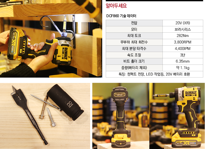 디월트의 20V MAX XR BRUSHLESS 임팩 드라이버 ‘DCF860’모델은 6.35mm 1/4인치 육각 비트를 사용한다. 이 제품은 디월트의 최신 브러시리스 모터와 고효율 전자 제어 시스템을 적용해 최대 282Nm 토크의 힘을 보여주는 제품이다. 수치만 보면 임팩 렌치와 비슷한 수준. 디월트 전동공구 이재훈 과장의 말을 들어보자.
