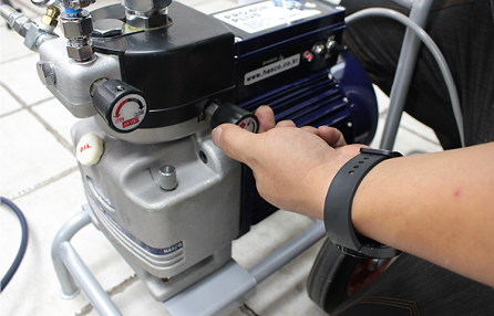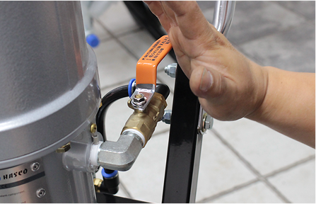 그 다음 몸체 우측의 메인밸브를 잠근 뒤 펌프 뒤쪽 연결부에 에어 콤프레샤를 연결합니다.