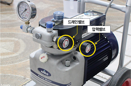 에어리스 펌프의 사용을 위해서는 압력밸브와 드레인밸브의 열고 닫는 순서가 매우 중요합니다.