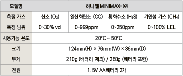 하니웰 복합가스측정기 MININAX-X4 역시 산업안전보건법에 따라 밀폐공간에서 측정해야 하는 4대 가스, 산소·일산화탄소·황화수소·가연성 가스를 동시 측정 가능하다. 작고 견고한 디자인과 가벼운 무게로 휴대가 용이하며 클립을 이용해 주머니, 벨트, 안전모 등에 손쉽게 착용 가능하다. 방진 방수 IP65등급, 셀프테스트 및 자동 영점 교정 기능이 탑재되어 있으며 LCD화면을 편하게 뒤집어 볼 수 있는 ‘Flip Display’기능 역시 장착되어 있다.