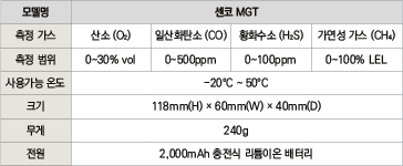 센코 복합가스측정기 MGT 모델은 산소·일산화탄소·황화수소·가연성 가스를 동시 측정 가능하다. 작동법이 쉽고 디스플레이 역시 한눈에 이해 가능한 구조로 되어 있으며 기기 상단의 IR Link(적외선 링크)로 설정 변경 및 데이터 다운로드가 가능하다. 이벤트 로그 / 교정 로그 / 범프 로그 각각 30건 이상 저장 가능하다. 방진 방수 IP67등급을 받았으며 리튬이온 배터리를 이용해 완충 시 약 25시간 연속 사용 가능하다.