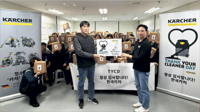 한국카처가 최근 청소 근로자들의 헌신에 감사를 전하는 글로벌 사회공헌 캠페인 ‘땡큐 클리너 데이(TYCD)’를 성공적으로 마무리했다. ‘땡큐 클리너 데이’는 청소 근로자들의 헌신에 감사를 전하는 글로벌 사회공헌 캠페인으로, 2015년 뉴질랜드 빌딩서비스협회(BSCNZ)와 협력해 시작됐다. 매년 10월 셋째 주 전 세계 50여 개국에서 진행된다. 한국카처 임직원들은 기업, 병원, 연구기관, 공공시설, 주거단지 등 다양한 현장을 방문해 청소 근로자들에게 고급 텀블러 및 타올, 감사 카드로 구성된 TYCD 기프트 키트를 전달했다. 또 방역과 위생 관리에 더욱 힘쓸 수 있도록 추첨을 통해 스팀청소기 ‘SC 2 디럭스 이지픽스’도 증정했다. 이와 함께 인스타그램 인플루언서와 협업해 TYCD 취지를 알리는 콘텐츠를 선보였다.