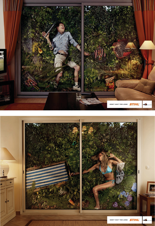 독일의 전동공구 회사 스틸은 재미있는 광고를 제작하기로 유명한 회사다. 이 시리즈의 광고에서는 자라난 정원의 풀 때문에 일상생활에 방해를 받는 이미지를 통해 ‘스틸이 있으니 정원 손질을 미루지 마라’라는 메시지를 전달했다. 공구 사진을 구석에 작게 배치한 데서 스틸의 자신감이 느껴진다.