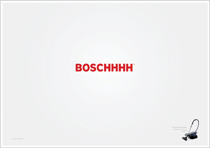 무엇을 말하고자 하는지 곧장 알 수 있는 보쉬의 광고. 보쉬(BOSCH)의 맨 뒤 H를 길게 늘여 ‘보쉬이이이-’하고 읽게 만드는 광고는 검지손가락을 입술에 댄 채 ‘쉬이-’하는 제스처를 떠올리게 한다. 그만큼 조용하다는 점을 강조한 광고다.