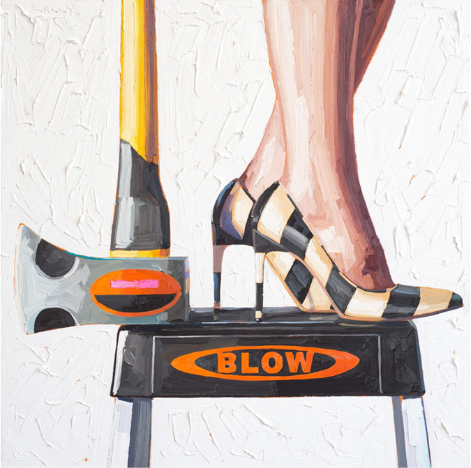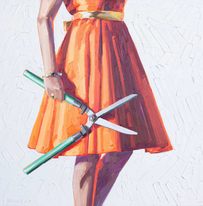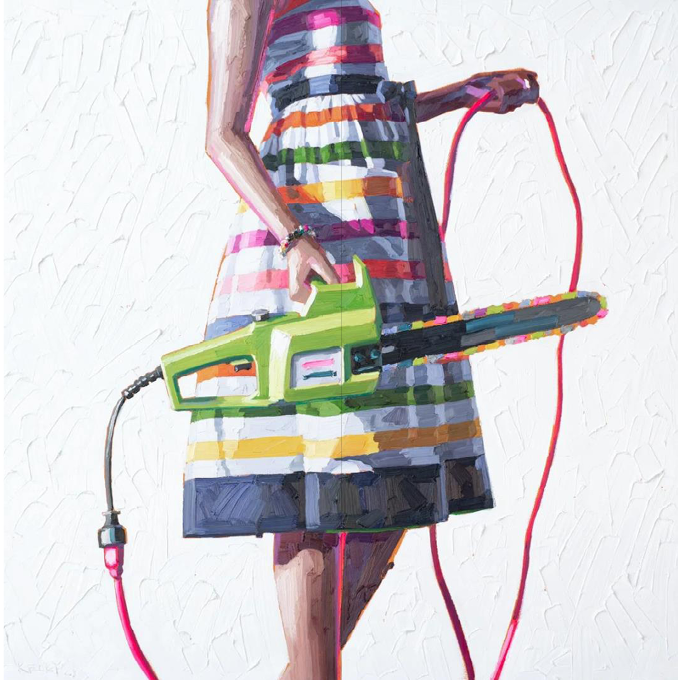 미국 작가 '켈리 림츤'의 작품에는 언제나 화려하게 차려입은 여성과 그 손에 쥐어진 묵직한 공구가 등장한다. 드레스 자락은 부드럽게 펼쳐져 있고 손끝에는 전기톱, 도끼, 해머 등의 공구들이 강렬하게 빛난다. 그녀의 작품 속 공구는 단순한 소품이 아니다. 캔버스 한가운데에 자리하며 작품의 무게 중심을 잡고 동시에 강력한 상징성을 표현한다. 여성성을 대표하는 드레스와 남성적 노동의 이미지를 지닌 공구가 같은 화면에 존재하면서 강렬한 대비를 형성해 낸다. 그리고 그 대비 속에서 이야기는 만들어진다. 결국 그녀의 작품은 하나의 선언처럼 읽힌다. “여성에게도 힘이 있다. 공구를 쥔 손이 남성의 전유물이 아니듯 드레스를 입은 손 역시 망치를 들 수 있다.” 하는 선언 말이다.