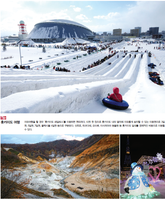 삿포로에서 반드시 봐야할 것 중 하나는 북해도 시계대. 1878년 세워진 이래 120년 동안 맑은 종소리로 삿포로를 알리고 있다. 구 북해도 청사는 네오바로크 양식으로 250만개 붉은 벽돌로 만든 중요국가문화재다. 아름다운 오오도리 공원에서 눈 쌓인 도심을 구경하는 것도 겨울에만 누릴 수 있는 특권. 눈 축제를 즐기고 싶다면 매년 2월에 열리는 ‘삿포로 눈 축제’를 노려보자. 국제적인 행사인 만큼 눈 조각 경연대회를 포함해 삿포로 시내 곳곳에서 다양한 볼거리가 펼쳐진다. 이번 겨울에는 내년 2월 5일부터 2월 11일까지 열릴 예정이다.