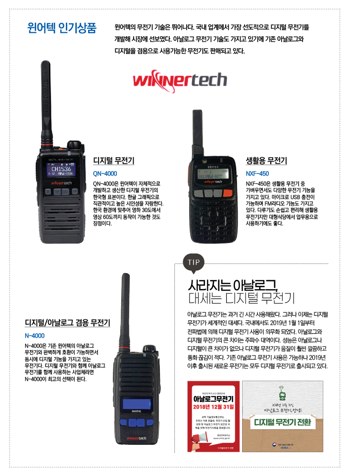 모든 국민이 스마트폰을 사용하지만 스마트폰, 휴대폰보다 무전기를 선호하는 사람들이 많다. 동시에 여러 사람에게 실시간으로 통화를 할 때, 긴 시간 실시간 통화가 필요한 작업에 무전기가 편리하다. 국내 최고의 무전기 제작기업 윈어텍을 찾아 보았다.