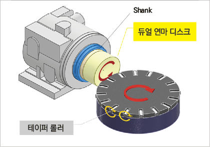 고품질 베어링은 자동차, 항공우주, 정밀기계, 로봇 등 국가 핵심 산업의 성능과 신뢰성을 좌우하는 필수 부품이다. 베어링 연마 디스크는 베어링 롤러 표면을 정밀하게 가공하기 위한(표면거칠기 Ra 0.05㎛ 이하) 연마공정에 사용된다. 기존 베어링 롤러 가공은 연마 디스크와 슈퍼피니싱 스톤, 두 가지의 공구를 사용함에 따라 가공 형상오차와 비용이 발생했다. 이 팀장은 베어링 제조기업과 연계해 1차 연삭 공정과 2차 슈퍼피니싱 공정을 단일 공정으로 통합하고, 한 번의 연마로 치수 및 형상 가공과 같은 연마와 슈퍼피니싱급 표면거칠기를 동시에 구현하는 하이브리드 연마시스템을 세계최초로 개발했다. 가공 시 발생하는 충격 흡수와 유연한 대응으로 미세한 표면 조절이 가능한 ‘탄성 바인더’를 적용하여 고부가 기술을 탄생시켰다. 이러한 기술을 통해 해외 시장에 역수출할 수 있는 기반을 마련했다.