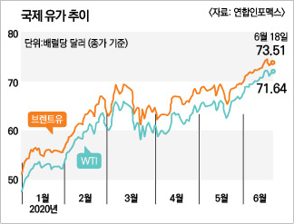 지난해부터 각국정부의 경기부양책으로 사상 초유의 자금이 시중에 풀려나갔고, 지금도 계속 재정확대 정책을 유지하면서 자금을 살포하고 있어 인플레이션 우려는 더 커지고 있다. 최근 유가는 하늘 높은 줄 모르고 치솟고 있고, 철광석, 구리, 알루미늄 등의 원자재 가격은 이미 하늘을 뚫고 올라갔다가 일부 조정세를 보이고 있다. 지난 7월 13일 뉴욕상업거래소 선물시장에서는 서부텍사스산원유(WTI) 8월물 가격이 전 거래일보다 1배럴당 0.8% 상승한 74.69달러에 거래를 마쳤다. 지난 2018년 10월 이후 최고가를 기록한 것이다.