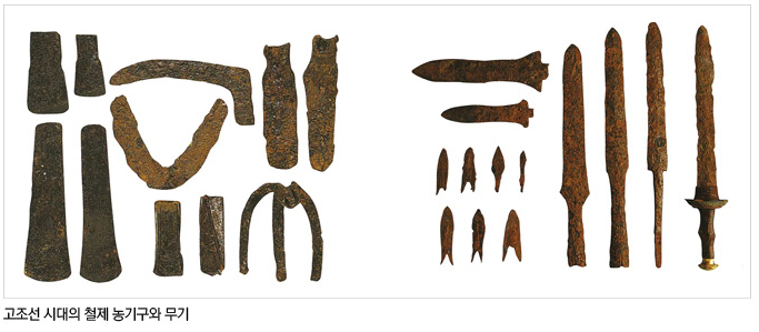 우리나라에 처음으로 철기가 도입된 시기에 관하여 북한에서는 BC8~7세기라고 하지만 남한에서는 대체로 위만조선 이전에 철기가 도입되었을 것으로 보고 있다. 철은 BC8-7세기에 이미 압록강과 두만강유역에서 생산되었으며, 연철 단계는 BC8~7세기, 고온환원법의 발전된 방법은 BC3~2세기에 시작되었다고 보았다. 중국 연(燕)나라에서 전파된 발전된 방법 이전에 독자적인 제철기술이 함경도지방에 있었던 것으로 보인다. 그러나 위만조선 시기 고조선 지역에서 철기가 보급된 것은 사실이며, 사회 전반적인 철제 농기구와 무기가 제작되는 등 철기문화가 사회의 발전 및 생산력의 증가를 가져왔다. 학자들은 고조선 지역에서 발견되는 강철의 비율을 볼 때 고조선 장인들이 제련로 안의 온도를 적어도 1400℃도 정도 유지한 상태에서 철을 14~16시간 정도 녹여냄으로써 질 좋은 강철을 생산할 수 있었다고 말한다. 고조선 장인들이 이와 같은 철을 생산할 수 있었던 것은 제련로의 완벽한 설계, 연료와 탄소 공급원으로서의 숯의 사용, 효율적인 송풍관 등의 덕분이다.