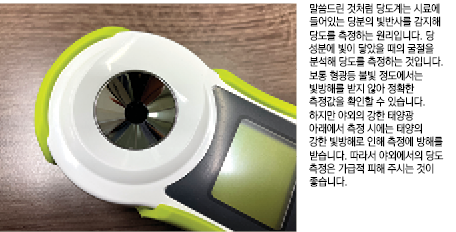 피치 못하게 야외에서 당도를 측정하는 경우 손으로 햇빛을 가린 상태에서 측정하거나 또는 그늘진 장소로 이동해 측정하는 것이 좋습니다.
