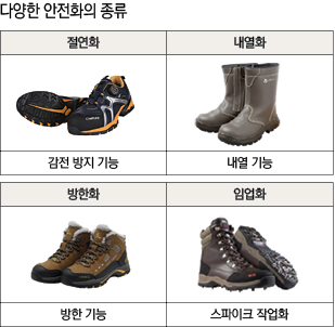 안전화 가운데에는 족부의 물리적인 안전뿐만 아니라 특수한 경우의 보호를 위한 기능이 갖추어진 특수화들이 있다. 고압 전류가 흐르는 장소에서 작업 시 작업자의 감전으로부터의 신체 안전을 보호해 주는 절연화부터, 화학 유해물질로부터 작업자 신체를 보호해주는 화학화까지 다양한 종류의 안전화가 존재한다. 본인의 작업 환경에 맞추어 안전화를 잘 골라 착용한다면 언제 닥쳐올지 모를 만약의 사태에 대비할 수 있을 것이다.