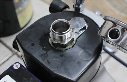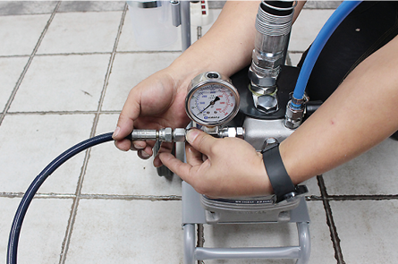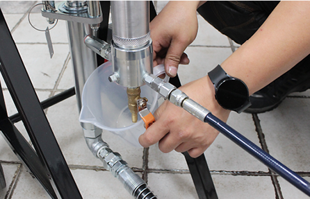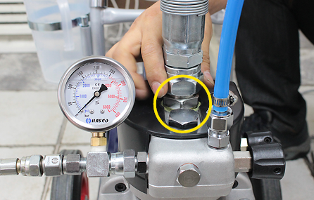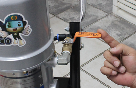 그 다음 몸체 우측의 메인밸브를 잠근 뒤 펌프 뒤쪽 연결부에 에어 콤프레샤를 연결합니다.