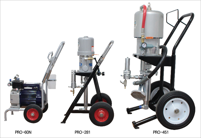 저희 하스코의 에어리스 펌프에는 전기식 펌프와 공압식 펌프 모델이 있습니다. 이 가운데 공압식 펌프 모델에는 73:1의 압력비율로 약 500바(bar)의 압력을 발휘할 수 있는 모델도 있습니다. 대량작업이 가능해 조선이나 중공업에 최적화된 모델입니다. 전기식 펌프 PRO-60N모델과 공압식 펌프 PRO-281, PRO-451모델에 대해 설명드리겠습니다.
