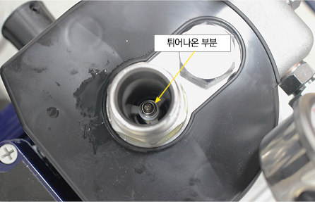 오일량이 적당한데도 흡입이 되지 않는다면 다른 문제를 생각해 봐야 합니다. 석션호스 연결부를 열어 호스를 빼내면 연결부 안쪽에 볼록 튀어나온 부분이 보입니다. 이 부분을 손가락으로 눌러 봤을 때 움직임이 느껴져아 하는데 움직이지 않고 굳어있다면 눌러붙은 것입니다. 그런 경우는 석션호스 연결부 부분의 교체가 필요합니다.