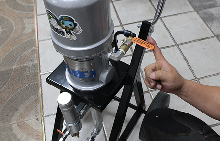에어리스 건으로부터 도료가 분사되지 않음을 확인하고 에어를 빼기 위해 메인밸브를 잠급니다. 그리고 서지탱크 하단의 밸브를 다시 열어 안에 남아있는 도료를 제거해 줍니다.