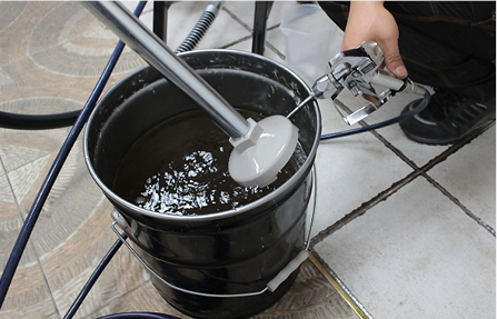 세척을 위해 우선 압력이 낮아진 펌프의 전원을 끈 뒤 신나 등 도료에 맞는 세척액을 준비해 줍니다. 그리고 각각의 호스를 세척액에 담근 뒤 작동시켰던 방법과 같은 과정으로 세척을 진행합니다. 도료를 분사하는 것처럼 세척액을 분사한다고 생각하시면 쉽습니다. 도료가 완전히 세척되어 세척액만 분사되는 것을 확인한 뒤에는 석션호스를 다시 들어 올려 에어리스건에서 공기만 분사되는 것을 확인해 세척액까지 완전히 빠졌음을 확인해 줍니다. 그럼 세척작업 완료입니다.